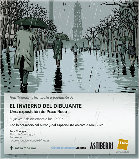 Y, por otra parte, mañana día 2 se producirá la presentación de la exposición "El invierno del dibujante: una exposición de Paco Roca" en la FNAC Triangle (Plaza de Catalunya, 4), con presencia de Toni Guiral además de la del propio Paco Roca. Esta exposición, aunque se presenta mañana, está abierta desde hoy 1 de diciembre hasta el 13 de enero de 2011Añadir Anotación