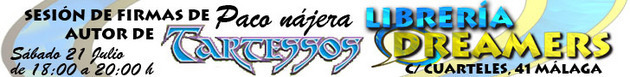 Paco Najera, autor de Tartessos (entre otros cómics), firmará el sábado 21 de Julio en Málaga, de 12:00 a 14:00 en la tienda OPENING COMICS de Velez Malaga y en LIBRERÍA DREAMERS de 18:00 a 20:00.