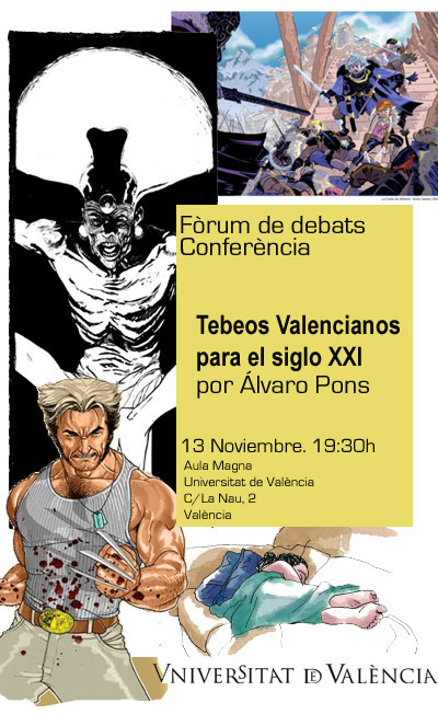El próximo martes 13 de noviembre, a las 19:30h, se impartirá en el Fòrum de Debats de la Universitat de València (Aula Magna, C/La Nau 2) la conferencia "Tebeos valencianos para el s. XXI", a cargo de Álvaro Pons, en la que se hará un largo recorrido por el tebeo valenciano de la década de los 90 y primeros años del nuevo siglo.