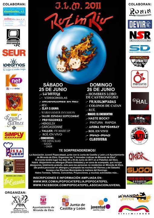 Tanto si conoces este tipo de ocio como si lo desconoces te animamos a pasarte y a disfrutar de la diversión en estado puro. Tendremos muchas actividades diferentes: torneos de juegos de mesa, torneos de juegos de cartas, rol, talleres, conciertos, rol en vivo, proyecciones... Además si vienes de fuera, tienes la opción de pernoctar, Tanto la noche del viernes, como la del sábado en el Albergue Juvenil Fernán González o en la zona de acampada habilitada en el propio albergue Sólo podemos decirte: !Animate a venir, ver y jugar! También queremos agradecer a todos los patrocinadores/ colaboradoresel apoyo que nos han brindado en esta ocasión, tanto con apoyo en medios como el apoyo moral que nos inyectan. ¡GRACIAS A TODOS! HORARIOS (Pueden ser modificados) SÁBADO DÍA 25 DE JUNIO: 10:00h. - Apertura de inscripciones en recepción; Ludoteca; Videoconsolas; Ordenadores en Red y mesas de juego (juegos de mesa, rol, etc... ininterrumpido). 11:00h. - Torneo LCG (Living Card Game): "Warhammer Invasion" 12:00h. - Clay`O´Rama 16:00h. - Taller: "Aprende a fabricar espadas de SoftCombat" - Torneo de Heroclix 17:00h. - Taller: "Escritura élfica" 17:30h. - Proyección - Título por confirmar (Casa de Cultura) 18:00h. - Taller: "FX Make Up" (Maquillaje FX) 19:00h. - Torneo: "Carcassonne" 20:00h. - Proyección - Título por confirmar (Casa de Cultura) 21:30h. - Apertura de puertas del Concierto presentación del "Extreme Mas Metal Festival" a cargo de "A.C. Mas Metal", grupos: (22:00h.) - Redentor (Vitoria-Gasteiz) (23:10h.) - The Metal Slug (Miranda de Ebro) (00:20h.) - Sugoi (Elorrio) (Entrada gratuita - Total 200 minutos aproximadamente) 22:00h. - Rol en Vivo: "Vampiro" - Rol en Vivo: "Espeleología" DOMINGO DÍA 26 DE JUNIO: 01:00h. - Los Hombres Lobo de Castronegro - Frikiolimpiadas (Empapuzate-pel; FreakTrivia; ZombieRace; Scrabble-Freak; Lanzamiento de Magic; y alguna sorpresa) 11:00h. - Torneo: "Los Colonos de Catan" - Torneo: JCC (Juego de Cartas Coleccionables): Magic 12:00h. - Torneo: "Haste bock?" 15:00h. - Concurso: "Pintura Rápida" - Arena de SoftCombat - Partida de Rol (por determinar) 17:00h. - Taller: "Escritura élfica" - Torneo: "Piko-Piko" - Rol en Vivo: "Dante 02" (Ambientación futurista) 19:30h. - Clausura Otros servicios ofrecidos: .- Habrá disponibles 45 plazas de Albergue para los más rápidos, a parte para los que no dispongan de plaza de albergue se ha habilitado una zona de acampada dentro del recinto del albergue, ambos tipos de alojamiento incluyen el desayuno. .- El domingo 26 por la mañana los inscritos podrán disfrutar de un refrescante baño en las Piscinas Municipales. .- Los inscritos se beneficiarán de descuentos en determinados sitios hosteleros de la ciudad. .- Además en los conciertos se sortearán abonos del festival "Extreme Mas Metal Festival" (18, 19 y 20 de Agosto) y merchandising - Por cortesía de A.C. Mas Metal. INSTALACIONES: Las Jornadas Lúdicas de Miranda "Rol in Río" tendrán su punto central de la actividad en el Pabellón del Ebro. Este pabellón es una instalación de uso deportivo básicamente, pero en esta ocasión se llenará de mesas y sillas para los participantes en las diferentes actividades de las jornadas. En el pabellón se instalará la recepción del evento donde los asistentes se podrán inscribir como participantes. Y esto les permitirá disfrutar de ciertos beneficios. También se dispondrán en este área los diferentes expositores donde los asistentes podrán encontrar diverso material como: Libros de rol, Juegos de mesa, Merchandising... A pocos metros del Pabellón del ebro se sitúa la Casa de Cultura, lugar donde podemos disfrutar de algunas proyecciones de películas de Serie B. Para ello tendremos a nuestra disposición una de las salas de video, dotada con proyector. Todos los participantes que asistan al evento y que no residan en Miranda de Ebro tendrán la opción de pernoctar en el Albergue Juvenil Fernán González, tanto la noche del día 24 (Viernes), como la noche del 25 (Sábado). El alojamiento incluye el desayuno de ambos días también. Al disponer de plazas de albergue limitadas, habilitaremos una zona de acampada, en la que todos los que acampen también tendrán derecho al desayuno de ambos días. Los inscritos a los que se les comunique que no han llegado a tiempo para obtener plaza de albergue deberán traer su propia tienda de campaña. En principio hay césped para poner las tiendas de campaña, pero puede darse el caso de que se llene el césped y haya que utilizar el campo de cemento que se ve en la fotografía inferior. Y a pocos metros del Pabellón del Ebro se encuentra la sala de conciertos "La Fábrica deTornillos" (Espacio Joven de la ciudad), donde la Asociación Cultural Mas Metal nos ofrecerá la entrada gratuita a la fiesta de presentación de su festival en agosto "Extreme Mas Metal Festival". Los grupos invitados son: Redentor, The Metal Slug y Sugoi. MÁS INFORMACIÓN En la web oficial, http://www.wix.com/ajpopocatepel/ajpopocatepel o en el Facebook http://www.facebook.com/popocatepel.asociacionjuvenil Fuente: Asociación Juvenil Popocatepel | |||