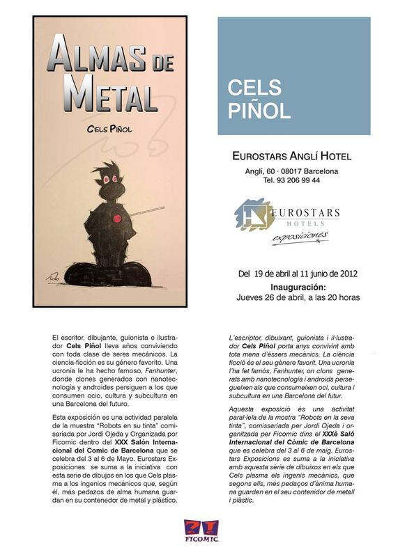Nos complace invitarles a la inauguración de la exposición Almas de Metal del Ilustrador Cels Piñol en el Eurostars Anglí Hotel de Barcelona (c/ Anglí 60). El evento tendrá lugar el jueves 26 de abril de 2012 a las 20:00h en el Eurostars Anglí y contará con la presencia del artista. La exposición podrá visitarse del 19 de abril al 11 de junio de 2012