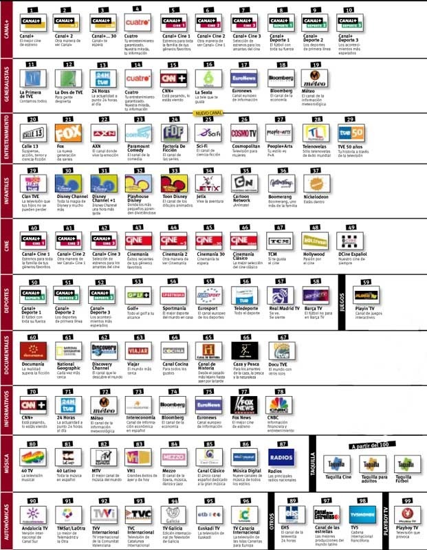El género documental se agrupa en torno a la franja del 60 con Documanía, Natgeo, Discovery, Viajar, Cocina, Historia, Caza y Pesca y Docu TVE. La pluralidad informativa llega de la mano de los 70 con CNN+, 24 Horas, Méteo, Intereconomía, Bloomberg, Euronews, Fox News y CNBC Europe. Por su parte, todos los estilos musicales se agrupan en la columna de los 80 con 40 TV, 40 Latino, MTV, Vh1, Mezzo, Canal Clásico, Música Digital y Radios. Por último, la oferta de televisiones Autonómicas cierra esta nueva organización ocupando la banda de los 90 con Andalucía TV, TMSat/La otra, TVV Int., TVC Int., TV Galicia, Euskadi TV y TV Canaria).Añadir Anotación